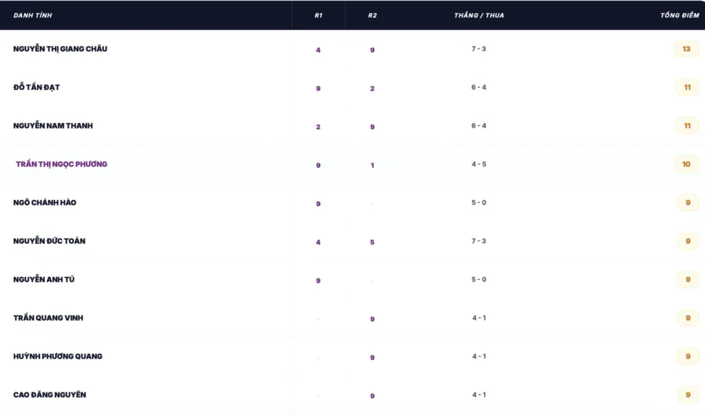 Để theo dõi chi tiết tỉ số các trận Thắng/Thua và hiệu số của từng vận động viên, mời anh em truy cập ngay Webapp chính thức của giải đấu: