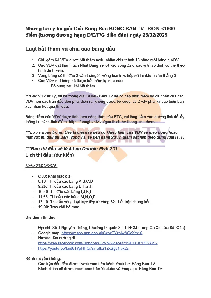 – Bắt thăm thi đấu vào lúc: 12:00 ngày Thứ Sáu 21/02/2025 tại TT Đào Tạo BÓNG BÀN TV (số 1 Nguyễn Thông,Phường 9, Quận 3), 🔴 livestream trực tiếp trên Bóng Bàn TV