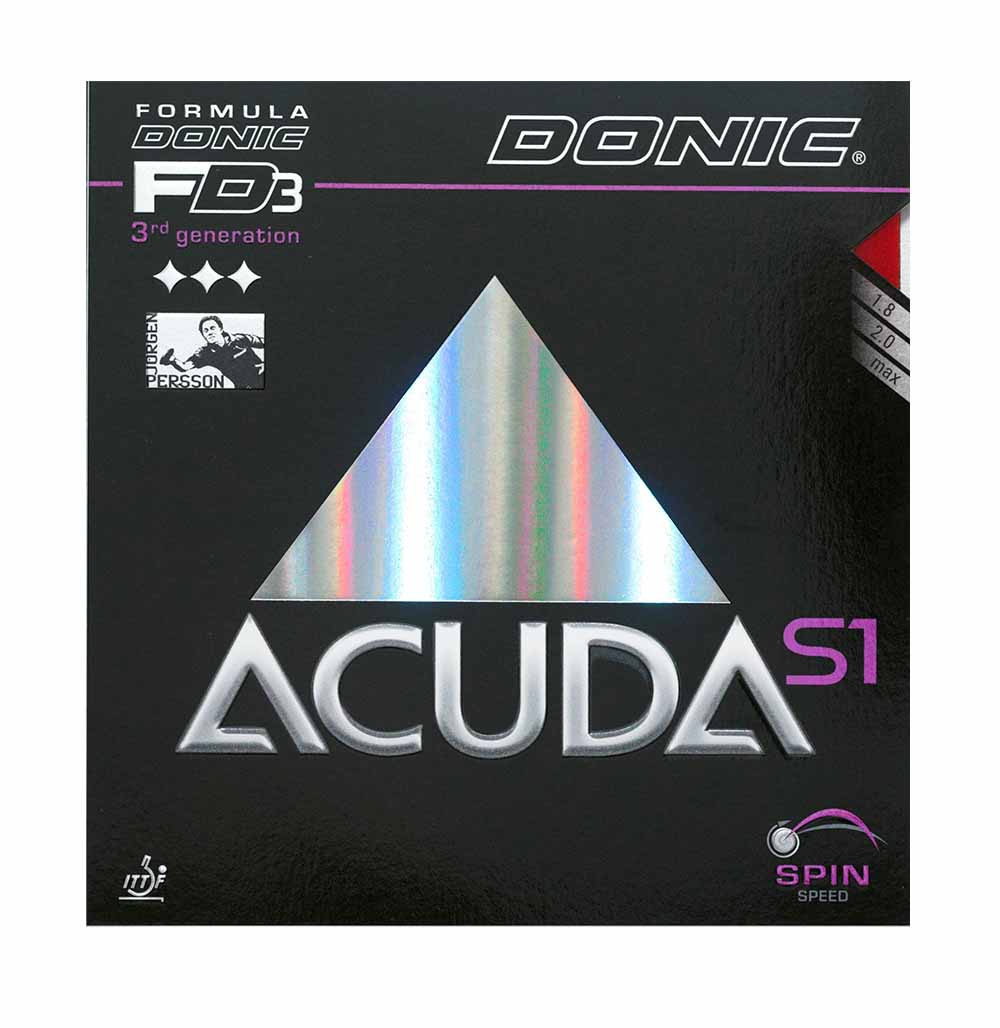 Donic Acuda S1 là loại cao su topspin động với tốc độ cao và độ xoáy tốt. Có thể chơi các bức ảnh kết thúc rất trực tiếp. Do luân chuyển phát triển tốt nên các mũi tấn công đều tỏ ra nguy hiểm. So với Donic Baracuda, Acuda S1 có sức mạnh lớn hơn và quỹ đạo bóng phẳng hơn.